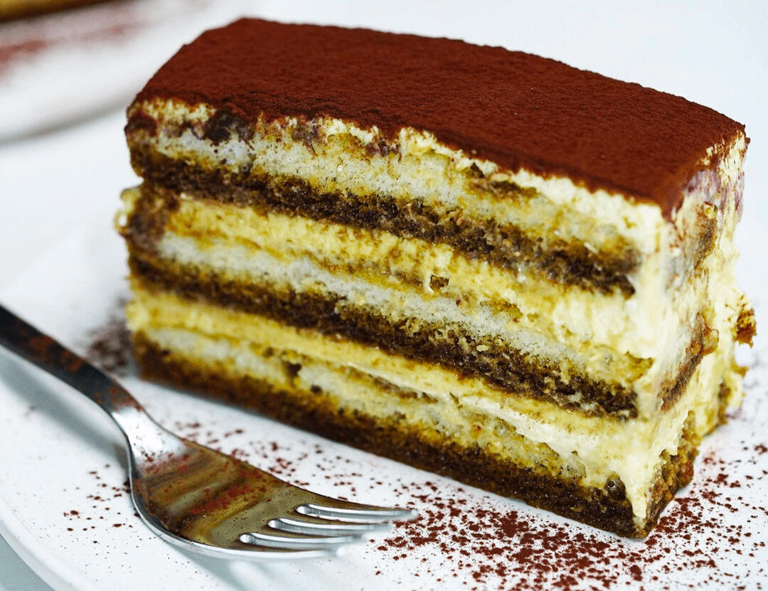 Classic tiramisu, with mascarpone cheese layered between coffee (or rum!) soaked lady fingers.